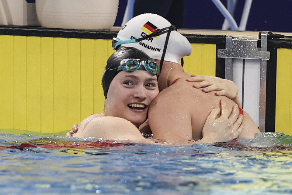 8月9日,冠军德国选手霍尔特(左)与亚军德国选手奥珀曼在比赛后拥抱庆祝。新华社记者 张丽芸 摄
